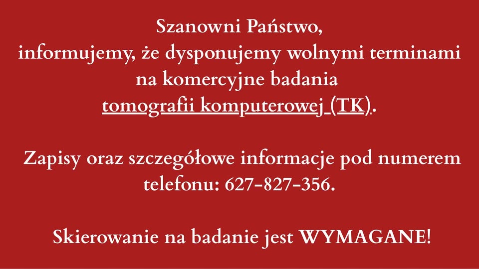 informujemy, że dysponujemy wolnymi terminami na komercyjne badania tomografii komputerowej (TK).